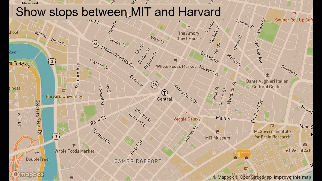 A bus travelling along its route, indicated by shifting stops on the map. A map api exercise.